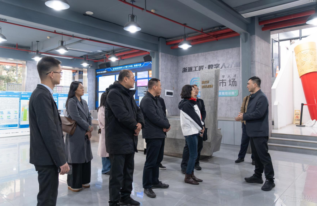 马艳副局长一行在祝孝林的引导下,实地察看了浙派工匠 · 数字人才基地及数字零工市场各核心功能区,详细了解了基地在 “培训 - 评价 - 就业 - 创业” 全链路服务中的运营模式与实践成效。作为浙江省首个数字化人才培养基地、省级示范零工市场,依托沃土股份数智化技术支撑,每年为超 5 万人次数字技术技能人才提供培训、评价、就业等配套服务。