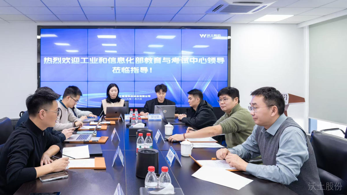 2026年1月6日,工业和信息化部教育与考试中心信息化处领导穆步洲、陈穆珩一行到访沃土股份进行调研。公司总裁严学明、副总裁杨国华、副总裁兼产研中心总监陶万扬、项目总监盖世峥等现场交流。