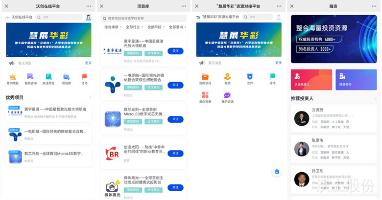 沃聚科技深度参与“慧展华彩”资源对接活动的策划、组织与执行工作,同时打造了线上资源对接平台,于7月12日正式开通,将创业项目、社会资源、政府政策资源一体化呈现,提供全方位、一站式服务支撑,IDG资本、真格基金、德石资本、鼎晖投资、吉富创投等多家投资机构入驻平台。项目方和资源方通过平台进行实时沟通,实现精准、高效、快速的意向对接。10月15日举办的线下对接巡展活动是对线上资源对接平台和线上对接巡展的强力补充,以期促进项目方和资源方深度接洽、互通需求,加快推进大赛项目融资、落地、孵化进程。