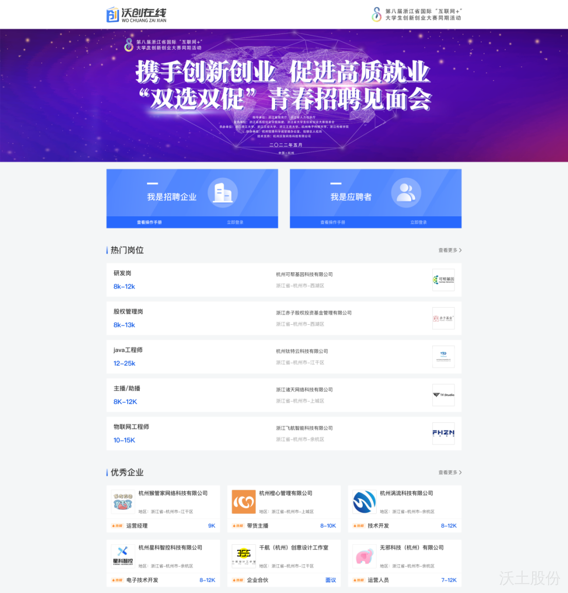 根据浙江省教育厅、浙江省人力社保厅确定的“48小时行动”要求,沃聚科技作为本次活动技术支持单位,基于“沃创在线丨智慧创就业服务云平台”快速构建“双选双促”创业就业云对接专项通道,创新型创业企业通过平台一键发布岗位招聘需求,青年大学生智能匹配岗位、投递简历,并与企业在线沟通,云端“双向双促”景象热闹非凡!