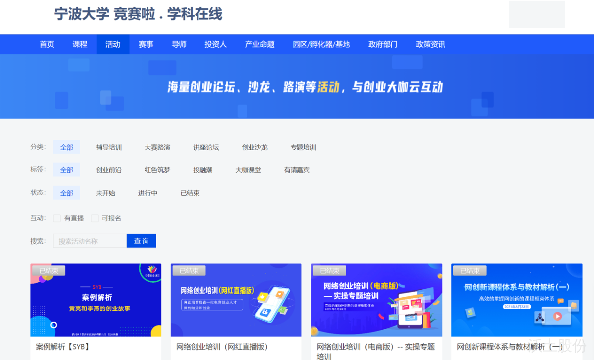 宁波大学围绕 “融合递进式”双创人才培养体系,以服务性、育人性、发展性为建设理念,聚焦项目成长性、学生成长性两条主线,结合沃聚科技数字化能力,着力打造涵盖项目管理、赛事管理、活动管理、园区管理、资源管理和数据驾驶舱六大模块的“竞赛啦·学科在线”双创管理服务平台。