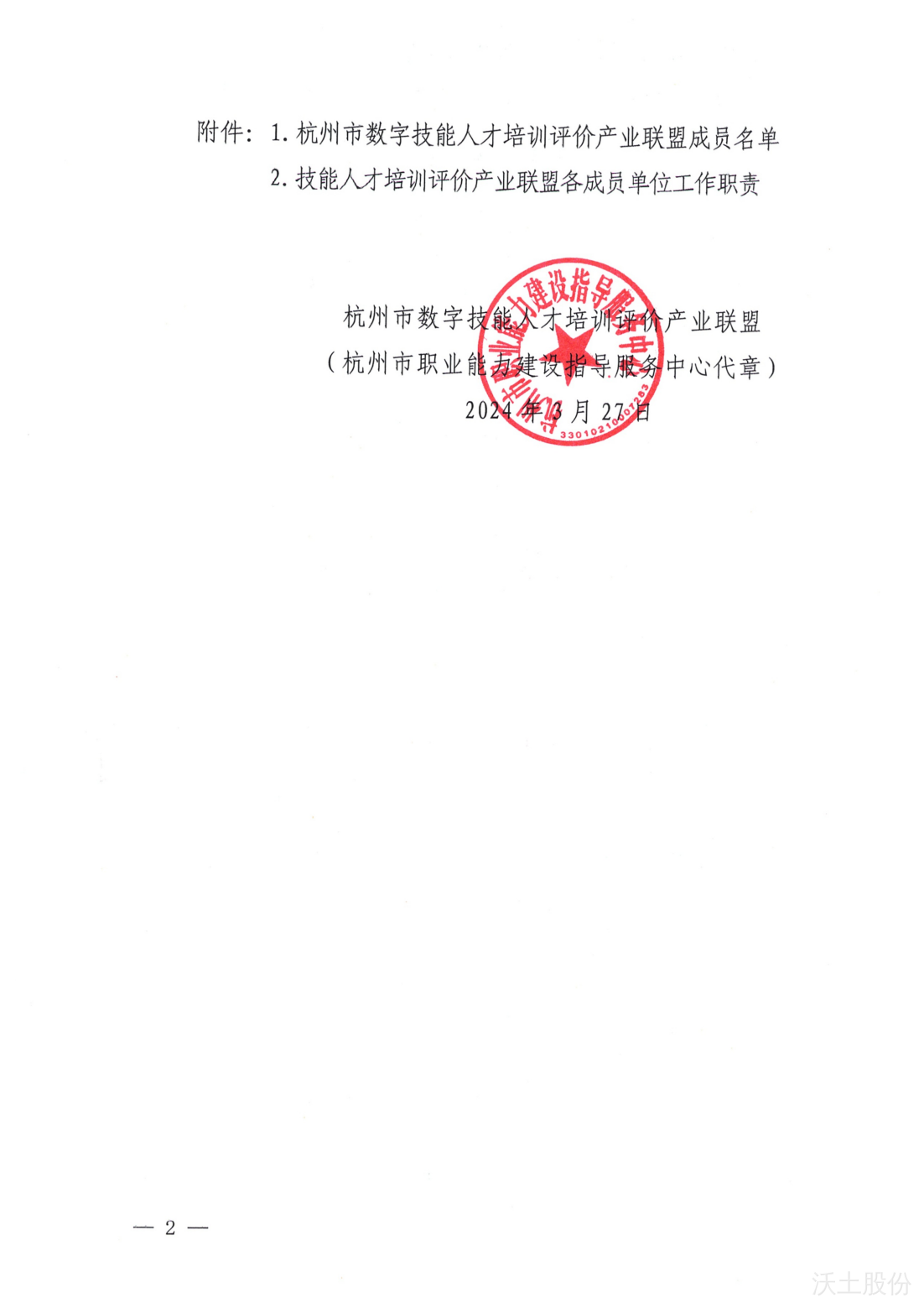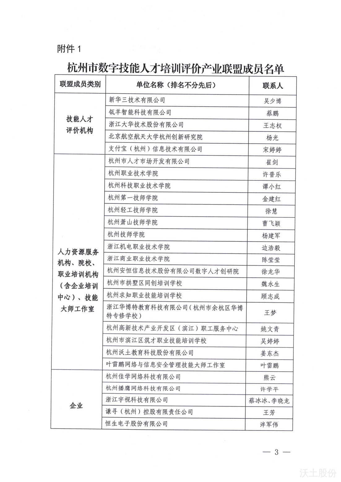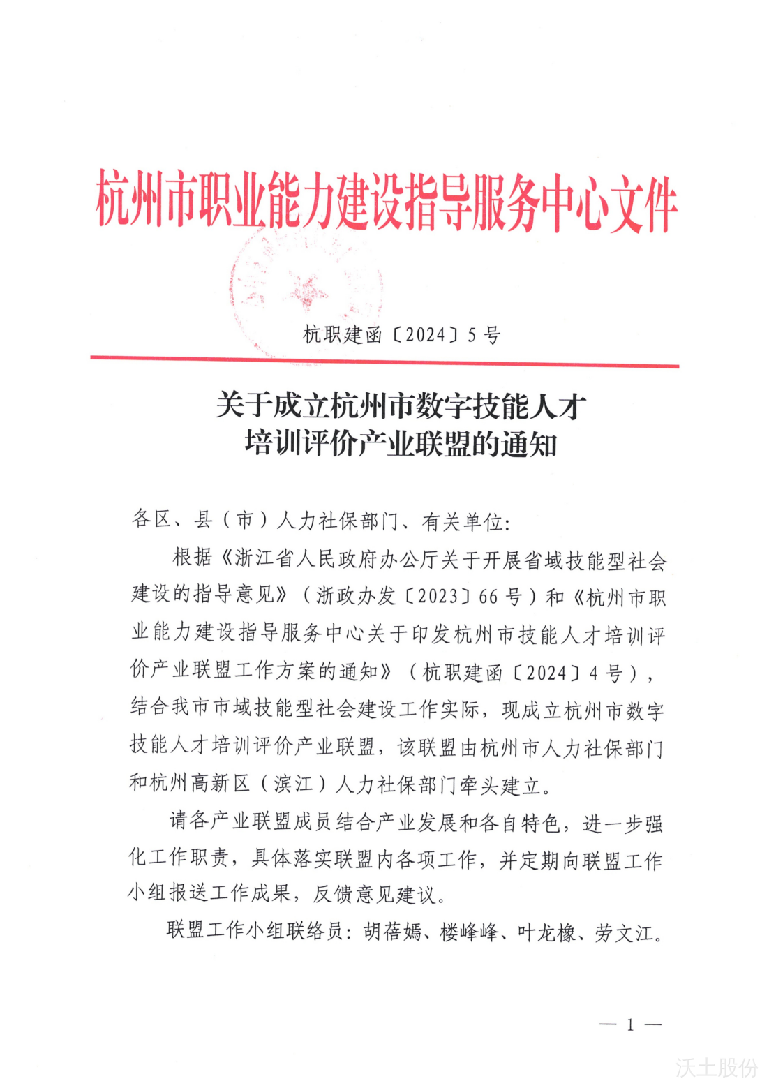 近日,杭州市职业能力建设指导服务中心正式发布了《关于成立杭州市数字技能人才培训评价产业联盟的通知》(杭职建函〔2024〕5 号),杭州沃土教育科技股份有限公司(简称“沃土股份”)凭借在数字技能教育培训领域的深厚积累与卓越贡献,成功入选杭州市数字技能人才培训评价产业联盟首批成员单位。